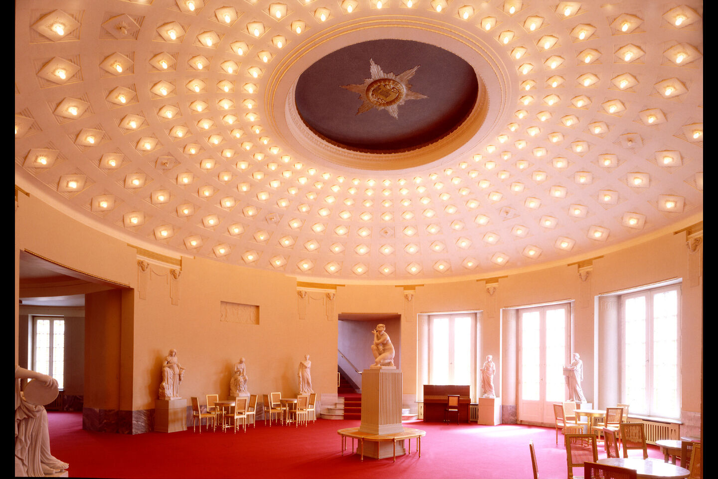 Im Inneren findet sich die gleiche Mischung: Der Schwung des Jugendstils wird mit Elementen anderer Zeiten verbunden, das Neue mit dem Bekannten, das sich wechselseitig erhöht zu einem gesteigerten Lebensgefühl. Zu diesem Gefühl trägt auch die von Sehring konzipierte Beleuchtung bei: Eine Unmenge nur architektonisch eingefasster Glühbirnen strahlt wie ein Sternenhimmel von den Decken der Foyers und des Zuschauerraums.