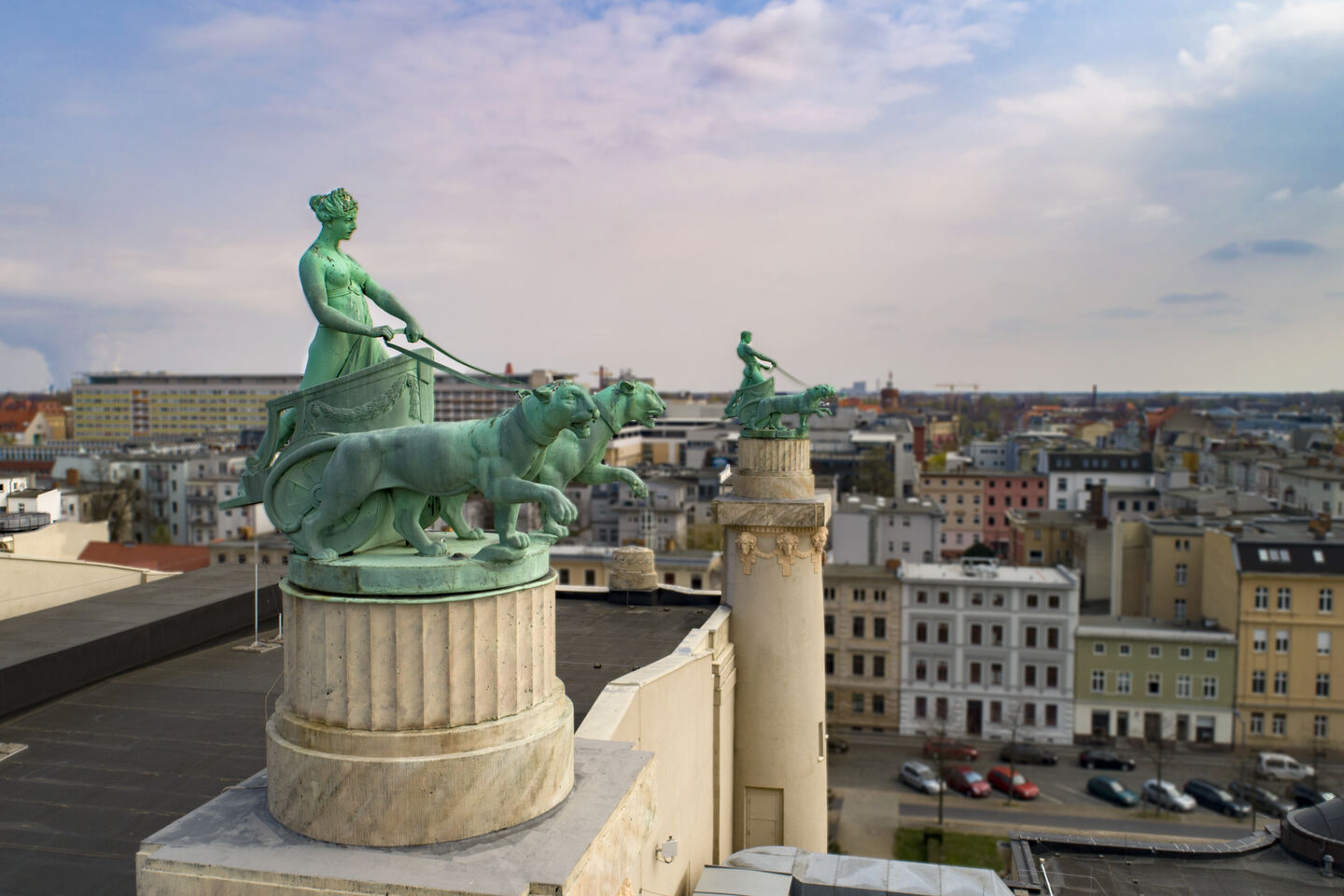 In Cottbus fällt der Stilkontrast vergleichsweise dezent aus. Die großen Linien des Gebäudes schwingen, innen wie außen, im Jugendstil - Cottbus wollte modern sein, und dies war der damals modernste Stil. Kommt man näher, bemerkt man manche Details, die mit diesem Stil kaum etwas zu tun haben, z.B. kleine Putten auf den Balkonen oder die Sandsteinquader des Erdgeschosses. Interessant ist das häufige Auftreten von Tieren: Löwen lagern als Skulpturen an den Auffahrten, unter den seitlich angebrachten Wandbrunnen und auf dem Dach; Widderköpfe finden sich als kupfergetriebene Reliefs; und auf zwei Säulen, die das Bühnenhaus flankieren, stehen Streitwagen, die von Panthern gezogen werden. Raubkatzen und Böcke sind Attribute des Gottes Dionysos, der auf einem der beiden Wagen steht; den anderen Wagen lenkt seine Gefährtin Ariadne. Dionysos ist nicht nur der Gott des Weines, aus seinen Festumzügen entwickelte sich einst das griechische Theater.